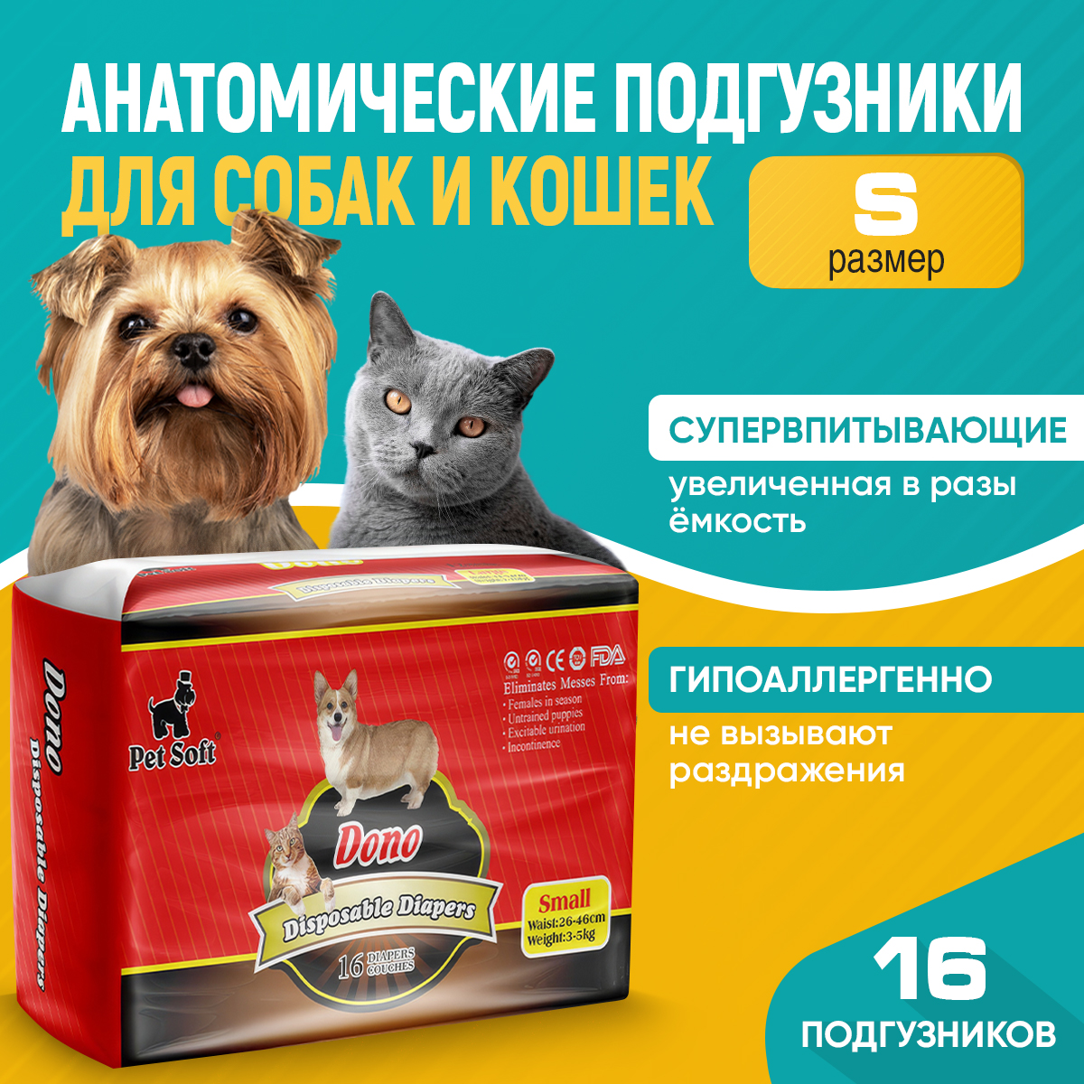 Подгузники для собак для кошек размер Dono размер S 16 штук